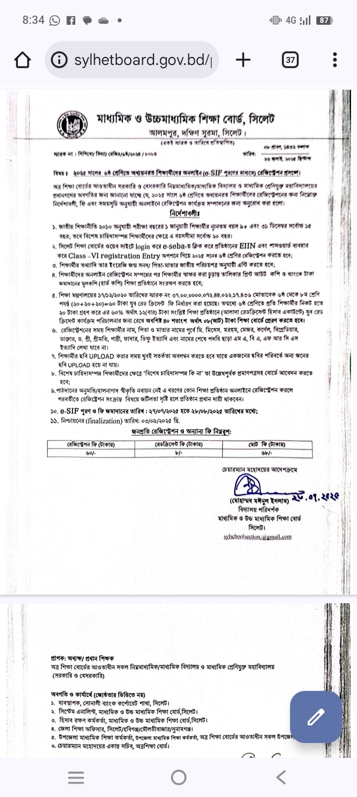 ২০২৬ সালের ৬ষ্ঠ শ্রেণিতে অধ্যয়নরত শিক্ষার্থীদের অনলাইনে(e-SIF পূরণের মাধ্যমে) রেজিস্ট্রেশন প্রসঙ্গে।
